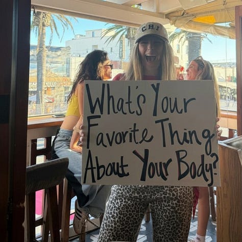 A group of 4 women approach me to answer - two of them said their legs, one said her eyes, and the fourth couldn’t think of one. So her friends helped her out. She ended up saying her hair, which has had BEAUTIFUL, thick hair. I loved witnessing her friends brainstorm things they liked about her body, so she could maybe start to see herself in a new light.