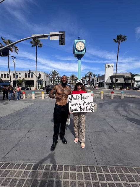 Dominic, a man with a skateboard and a heart monitor, stopped over enamored with my question. He said he can’t believe more people weren’t surrounding me to answer because we live in LA, and everyone here loves their bodies. He said his was the fact that he’s still here. He has a heart condition that limits his activity, but he’s been on a new medication and has been able to do more - like skateboarding and going in the ocean this day. He tried to rally people over to answer, and it was really kind.
