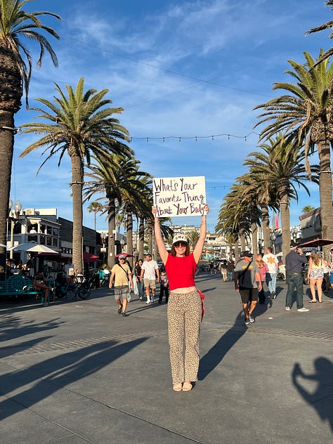 I stopped by the bathroom before heading to meet my friends, and on my way out, a woman stopped me and said she saw me earlier at the pier. She asked about my sign, we chatted for a bit, and she mentioned she used to be a ballet dancer. She then asked how she can contribute to my work! It was such a wonderful moment. I gave her the options, and she decided she wants to record a conversation with me. So stay tuned!!